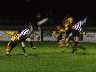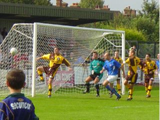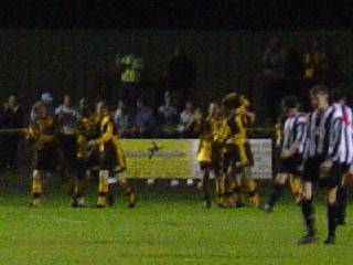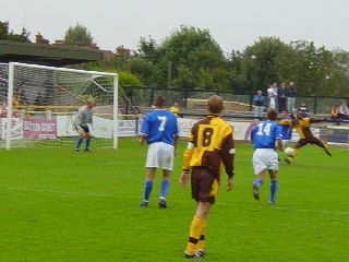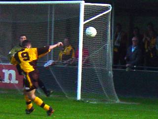 Right, The U's celebrate the opening goal. U’s v Hitchin (19/10/02) Hitchin’s Top Field stadium is a work of art. Remember, though, that a messy bed or a wall made of butter are priceless pieces. The designer wooden terraces remain, freshly coated with creosote and as safe as a turkey at Christmas. That people risk their lives standing on them is beyond belief. Surprising, too, is that Sutton, unbeaten in the league for 6 games, lost to a rather ordinary looking Hitchin side. Neither side fashioned any great chances in the opening half-hour. United looked unsteady in midfield and gave the ball away all too often with a succession of sloppy passes. No game for nearly two weeks seemed to have cost the team the element of sharpness and fight that had been present in coming from two goals down against Chesham and Hayes. A number of free-kicks around the Hitchin box failed to lead to a goal but when Mark Watson was put through around the 30 minute mark the deadlock was surely going to be threatened. Past the last man, Watson was clearly pulled back and then bundled over by the Hitchin centre back, James Ayres. The referee and his assistant gave nothing when a red card looked to be the only option. Minutes later the home side took the lead when their winger, Tony Fontonelle, breezed past two U’s defenders and slid the ball wide of Andy Pape into the far corner of the net. With the half almost over, Watson controlled the ball on the corner of the Hitchin area but his cross was blocked by a defender’s hand. As the ball fell back to his feet he knocked it around the same defender and was scythed down in a cynical manner – penalty. Excellent, an equaliser before the break, we thought, but Danny Bolt’s spot-kick was weak and too close to the ‘keeper, who slumped to the ground to collect it. Half-time: U’s 0, Hitchin 1. Three minutes after the restart, Hitchin extended their lead to two when Matt Nolan passed the ball across the area to Ayres, amazingly still on the pitch following his first half challenge on Watson. He had the simplest of tasks in pushing the ball home at the back post as he rushed to meet the cross. The introduction of Matt Gray for Bolt on the hour gave Sutton’s midfield more zip but clear chances were hard to come by. Late in the game, Watson headed just wide and Lewis Gonsalves, solid at the back, got forward but could not bundle the ball past the Hitchin ‘keeper. Dave Timothy tested their ‘keeper from the corner of the box but United were unable to force their way back into the game. A frustrating result meant a lengthy rail trip back to Sutton with little to smile about. Full-time: U’s 0, Hitchin 2. Team: Pape, Timothy, Hollands, Palmer, Brett (Honey), Bailey, Bolt (Gray), Corbett, Fowler, Watson, Gonsalves. Sub (n/u) Beale. Att: 456 ![]() Above, Danny Bolt misses the crucial first-half penalty. U’s v Hendon (22/10/02) Without a win in four games, United took on Hendon on Tuesday night looking to get back to winning ways on a wet Gander Green Lane pitch. After a frantic end-to-end start United opened the scoring with a well-worked move in the 8th minute. Danny Bolt broke with the ball from midfield and slid the ball through a gap in the Hendon defence to Nick Bailey who took one touch and then shot across the goalkeeper into the bottom left corner of the goal. Following the goal, Hendon, fourth in the league going into the game, slightly shaded the possession and chances - ably assisted by a large number of decisions in their favour from the referee and his assistants. In the 22nd minute, the ball fell to Hendon midfielder, Steve Forbes, on the edge of the box and his well-placed drive found the top corner of Andy Pape’s goal. Hendon continued to control the midfield but Sutton reclaimed the lead within ten minutes. A free-kick thirty yards out was begging to be hit by Bolt and indeed was, Scott Corbett tapping the ball to Bolt who unleashed a thunderous drive past the Hendon ‘keeper who didn’t even move. Sutton clung desperately to the slim lead but Hendon were again to equalise – this time deep into first-half injury time. A corner to the near post was headed goalwards by a Hendon forward and was blocked on the line but the rebound unfortunately fell to an attacker, who swept the ball into the U’s net. Half-time: U’s 2, Hendon 2. United began positively after the break, dominating the play in the middle of the park and putting together some quality passing sequences. Bolt was presented with another chance to score following a foul on Matt Fowler just outside the area but this time his free-kick looped harmlessly over the bar. Fowler himself almost got on the end of a ball into the Hendon area but was beaten to it by the ‘keeper and minutes later his run into the box was ended by an apparent foul but there was to be no penalty. Mark Watson also had a decent shout for a penalty turned down - a Dave Timothy cross was met by Watson but in getting to the ball he was impeded by two Hendon defenders and was only able to head over from five yards. Hendon slowly began to reassert themselves on the game but United were very unlucky when a point was taken from them with another injury time goal – a Hendon forward found space in the box and knocked the ball past an exposed Pape. Sutton deserved more from the game but will need to win soon to prevent this run without a win turning into a slump. Full-time: U’s 2, Hendon 3. Team: Pape, Timothy, Hollands, Palmer, Ottley, Bailey, Bolt, Corbett, Fowler, Watson, Gonsalves. Subs (n/u) Gray, Beale, Honey, Hanlan. Goals: Bailey (8mins), Bolt (32mins).