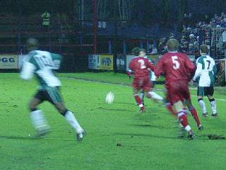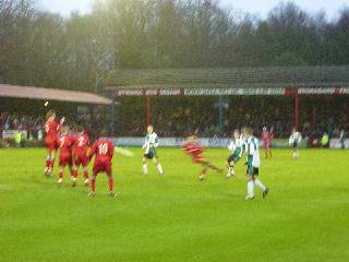 Left, Mark Watson makes a run for a Mike Hollands pass. Right, Danny Bolt's free-kick heading towards the Aldershot wall. U’s v Bedford (28/12/02) As the New Year draws ever closer the U’s were looking to end this one on a high and reverse the defeat we received back in August at the hands of the visitors. The first half was fairly even, with the U’s probably just shading it. Nevertheless neither side really challenged each others ‘keepers. The best chances falling to the U’s when Matt Gray managed to whip in several dangerous crosses from the right-hand side, with both Matt Fowler and Mark Watson ending up in the back of the net on one occasion. Half time: Sutton 0 Bedford 0 The second half again saw the two sides making no real headway. With the best chance for Bedford being a long range free kick which was beaten easily away by Andy Pape. Suttons best chance occured when we managed to beat the Bedford offside trap, Mike Hollands chipped a great ball into the Bedford area, but Gray and Watson couldn’t get to the ball in time. The last five minutes saw the U’s burst into life, the first opportunity saw a long diagonal ball from midfield being headed past the Bedford ‘keeper by a stooping Watson. However, this forced him wide and he couldn’t find the required power to put it away with his left foot and the attempt was duly cleared. Minutes later Bolt managed to spray a cross field ball into the path of a charging Gray, but after taking it around the keeper he could only take it to the by-line and chip it back towards a heavily marked Watson, and the cross was cleared for a corner. This was the first game since Saturday 26th October that the U’s had failed to score in and only our fifth goalless game of the season so far. Full time: Sutton 0 Bedford 0 Team: Pape, Gray, Beale, Palmer, Gonsalves, Hollands, Bailey, Bolt, Corbett, Fowler, Watson. Subs: Honey, Akuamoah, Brooker Attendance: 719