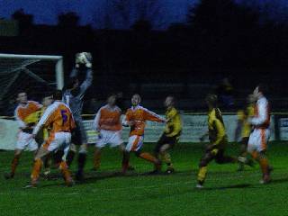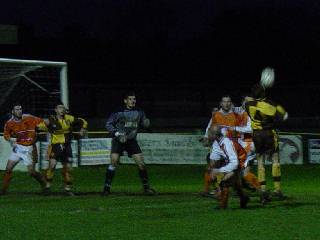Right, Ryan Palmer tries to head a Bolt corner towards the goal. U’s v Havant & Waterlooville F.A. Trophy 3rd Round (11/01/03) It was a series of pitch inspections that eventually confirmed that the game would go ahead, although after the game we wished it had been postponed. The game started with the yellows showing the most promise and generally having the majority of the possession. It seemed like it wouldn’t be our day though when several chances all went begging around the twenty-minute mark. The first fell to Mark Watson who found himself one on one with the Havant & Waterlooville ‘keeper, however Steve May spread himself well to stop Watson from flicking it over him. Less than a minute later Matt Fowler found himself one on one with May as well, this time Fowler managed to get round May, but couldn’t find the power to push the ball into the empty net and it was cleared with yards to spare. The U’s fans had barely got over that when Danny Bolt looked up from his wide position on the left and chipped a perfect ball into Watson’s stride on the other side of the box, again May advanced and forced Watson wide. Watson then managed to pull the ball back through a gathering crowd of Hawks’ defenders to find Nick Bailey. Bailey was eyeing up a side foot into the predominantly vacant net, but the pitch conditions let him down and a violent bobble meant a very poor connection for Nick and the ball was subsequently cleared. From this opening period the U’s looked comfortable and hadn’t really been troubled. In the 25th minute this all changed, Havant & Waterlooville’s first meaningful move forwards led to the opening goal. A through ball from the midfield caught the U’s defence flat footed and a rasping shot from Bobby Howe found the bottom right hand corner of the net via Andy Pape’s hand, who was powerless to stop it. Before we could quite believe what had occurred against the run of play James Taylor had rounded Pape, who was floundering around on the floor, and to everyone’s surprise fired high and wide of the unguarded Sutton net. The remainder of the first half passed without incident although Havant & Waterlooville were definitely starting to impose themselves on the game. The second half started much as the first had ended with Havant & Waterlooville on top. They eventually concreted their position with two goals in the space of 4 minutes, nine minutes into the second half. The first was a long throw that was flicked on at the near post and then put into the net by Warren Haughton. Before the U’s even had thought about responding Tim Hambley met a cross and steered it towards the bottom right hand corner of Pape’s goal. Andy Pape did well to get to it but couldn’t stop it from sliding just over the goal line. This prompted a most unusual response from John Rains, a double substitution. So on came Paul Honey and Eddie Akuamoah for Darren Beale and Danny Bolt. It was also quite easy to see that Bolt wasn’t pleased with his or his teammates’ performance, as he went straight to the dressing room. The change kicked in and the U’s started to look a lot livelier. But still we could not turn possession into a good chance on goal. In fact it wasn’t until the 83rd minute that the pressure provided the U’s with a consolation goal. After some good work by Nick Bailey and Matt Gray the ball bobbled through the crowded penalty area and found itself with Mark Watson on the edge of the 6-yard box who turned and powered the ball into the net. Unfortunately it came too late for the U’s to turn around the remaining two-goal deficit. All in all we paid for the chances that we failed to capitalise on in the early stages of the first half and then never really challenged a ‘keeper who looked very dodgy in the air but excellent at one on ones. Havant & Waterlooville to their credit defended solidly to maintain and extend their lead. Final score: U’s 1 Havant & Waterlooville 3 Goal: Watson, 83 mins. Team: Pape, Hollands (Akuamoah), Gonsalves, Palmer, Brooker, Gray, Bailey, Corbett, Bolt (Honey), Fowler, Watson. Subs(n/u) Beale, Smith. Attendance: 645 U’s v Billericay (18/01/03) After the disappointment of last weekend’s F.A. Trophy defeat to Havant and Waterlooville, United looked to get back to winning ways and take all three points against Billericay to maintain a high league position. Matt Fowler had a chance to open the scoring after only seven minutes. He broke through the Billericay offside trap to latch onto a high ball from the United midfield, controlled the ball well, and steadied himself before going for an intelligent lob. His attempt to catch Jerome John off his line was foiled by the outstretched arm of the desperate goalie and the ball was cleared from danger. This proved to be Sutton’s best chance for a long time, as the majority of the match took place in the middle third of the pitch, neither side’s midfield capable of breaking down the opposing defence regularly. After eleven minutes, Danny Brooker, United captain for the day, suffered a setback on his recovery from a series of injury problems when he had to leave the field. Darren Beale replaced him in the centre of Sutton’s defence. With half an hour of the game gone, Billericay began to dominate the possession. With increased play around the Sutton area, Lewis Gonsalves picked up a yellow card for a debatable foul on an advancing visiting forward and, minutes later, the deadlock was broken when a ball into the area was flicked on at the near post and then headed over Jamie Ribolla by Gary Ansell. The goal did not spark the U’s into life, though, and we could have been further behind moments after the first goal but a thunderbolt effort from the edge of the area cannoned off Ribolla’s bar and out of play. Half-time: U’s 0, Billericay 1. The second half was much the same as the first, and like the opening 45, the first real chance fell to Sutton. On the hour mark, Nick Bailey