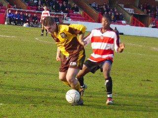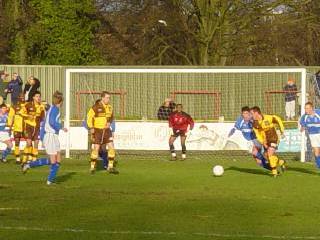 Right, Danny Bolt looks for a way past the Billericay defence. U’s v Kingstonian (25/01/03) At a sunny Kingsmeadow, Sutton and Kingstonian played out a typical local derby – goals, brawls and sending-offs – but United left their financially crippled neighbours with no points to show for a game in which at least a share of the spoils was well-deserved. Kingstonian controlled possession in the early exchanges as United struggled to impose themselves on the match. It was no surprise, then, when the K’s took the lead after only nine minutes, but for the Sutton players and fans it was a disappointing goal to concede, as a dangerous cross allowed Tim Sills to jump unmarked and head past Jamie Ribolla. Ten minutes later it was two-nil to Kingstonian and Sills was again the scorer. On this occasion he found space from a low corner to meet the ball ten yards out and his weak shot fortunately found a way through a crowd of players and past an unsighted Ribolla, who could not react in time to save. This second goal brought United to life and we finally began to push on towards the Kingstonian goal. After twenty-five minutes, Sutton won a free-kick around twenty-five yards out. Nick Bailey tapped the ball to Danny Bolt and his low, drilled shot was spilled into the net by butterfingers Kingstonian ‘keeper, Lance Key. United were back in the match, and forged a couple of chances for an equaliser in the next five minutes. Firstly, Mark Watson turned a defender and played a one-two on the edge of the area with Bolt but could not get the ball past Key from eight yards. Then, minutes later, Bailey was given time twenty-five yards out to line up a shot at goal but narrowly missed a spectacular leveller. Watson was holding the ball up well, frustrating the K’s defenders, and he was soon brought down near the edge of the area. The Kingstonian defender then trampled onto Watson and punches were thrown as a large brawl erupted in the centre of the Kingstonian half. Incredibly, no-one was given their marching orders and only Watson and the offending defender were booked. With the wall standing about six yards from the wall, Bolt, looking to repeat his earlier goal from a similar position, complained to the referee and was booked for his efforts. Amazingly, the official then decided that Bolt was right and made the wall retreat a further few yards. After the long stoppage, Bolt’s shot was not as accurate as his first effort and the ball was cleared away. United were not in complete control, though, and Kingstonian had a couple of chances to stretch the lead back to two. Ribolla denied Sills his hat-trick when he stuck out a foot to prevent the striker rounding him for a certain third and ex-United man Phil Wingfield crossed dangerously into the area on a couple of occasions but to no avail. Half-time: K’s 2, U’s 1. After the break, my brother and co-editor Paul scored a rules victory over the linesman in the Sutton half when he told him that goalkeepers could not mark their area in the way that Key was currently doing. The referee’s assistant decided to enforce the rule, telling the experienced ‘keeper to desist from his blatant rule breaking. Clearly, from his performance in the second half, the lino passed on our other recommendation of being heavily biased in our favour. When play resumed, Kingstonian’s tactics were clear to see as they played for time at every available opportunity. Bolt continued to trouble his former employers, twice placing brilliant crosses over Key towards the back post but neither Watson nor Bailey could bundle the ball home and Kingstonian survived, once with apparent use of a hand that was not spotted by the linesman or the referee. Twenty-five minutes into the half, Sills increased the bad blood flowing through the match when he committed an obvious foul on Darren Beale. As the referee raced towards the players to prevent a further outbreak of fisticuffs, Sills knocked heads with Beale and rightfully earned his second yellow. After trudging slowly from the field, Sills raised both middle-fingers to the Sutton supporters that mocked his departure – an action that would land a professional player an F.A. disciplinary charge. With a numerical advantage, the U’s looked to play the ball around more and make the extra man count but still struggled to create a clear cut chance. The most likely source for a goal continued to be from crosses and corners into the box but the ball never fell kindly to a Sutton player and Kingstonian’s break-away tactics did not allow the team to flood extra men forward. With time fast running out John Rains introduced Scott Corbett for Darren Beale to help the United dominance in the midfield area. As the game approached its conclusion, the hosts stuck by their delaying tactics, their corner-taker picking up a yellow card for his time wasting. From the same corner, the K’s found themselves two men down after a mad, late challenge on Ribolla as he claimed the ball in the air by Peter Barnsby was rewarded with his second yellow card of the game and an early bath. Sutton pushed forward, in a desperate search for an equaliser as the game went deep into stoppage time. Bolt and Watson both had the ball in the area at times but were crowded out of possession and so could never test the ‘keeper and, immediately prior to the final whistle, the U’s had a further succession of corners but could not make one count. Final Score: K’s 2, U’s 1. Team: Ribolla, Beale (Corbett), Hollands, Palmer, Akuamoah, Bailey, Bolt, Honey, Fowler, Watson, Gonsalves. Subs (n/u) Hanlan, Brooker. Goal: Bolt 25mins. Att: 902