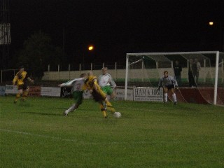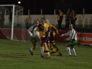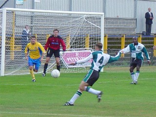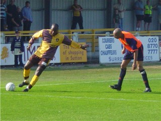 Right, Rob Collins beats a Hendon defender and shoots. U’s v St. Albans (06/09/03) United slipped to a second defeat of the season at rain-soaked St. Albans this afternoon. Sutton fielded the same team that had beaten Hendon on Tuesday but were unable to reproduce the same performance. Sutton started the game brightly, Eddie Akuamoah crossing to the back post where Dean Hamlin looped a header into the danger area – neither Rob Collins nor Nick Bailey could scramble the ball in, and when it broke to Paul Honey on the edge of the area, his shot was well over. Immediately afterwards United were on the back foot, though, a St. Albans forward turning past Ryan Palmer and hitting a low shot that Andy Iga did well to save diving to his left. With only nine minutes on the clock, St. Albans pressured the U’s into some sloppy defending – United giving away possession near the edge of the area and, when the ball was crossed in low from the left, Gary Wraight was left unmarked and free to knock it past Iga from six yards out. United tried hard to get back in the game, but struggled to create any clear cut chances in the next fifteen minutes, Bailey almost reached a through ball ahead of the goalkeeper after good work from Collins and Matt Gray, who later shot just wide with a left-footed drive from twenty-five yards out. On the half hour, Sutton’s defence almost conspired to gift a second goal to their opposition – a dreadful back pass to Iga could only be half cleared and ex-pro Miguel De Souza shot across the goal and wide after beating the U’s defence. De Souza continued to trouble United with his strength and pace, ghosting past his marker minutes later only for Iga to save well at his feet. There was no breathing space for Iga, as he was called into action again a minute later, palming away an attempted chip by their number seven after he had beaten Sutton’s offside trap. Sutton almost equalised in injury time in the first half. The St. Albans keeper rushed to the edge of his box to clear the ball but only knocked it up in the air and about ten yards down the pitch to Gray, who controlled and volleyed it before the ‘keeper could get back in his goal but it went just wide of the left post. Half-time: St. Albans 1, U’s 0. After the interval, St. Albans quickly dented Sutton’s aspirations of a win when they scored for the second time – Graeme Tomlinson getting between the back line and Iga and cleverly flicking it over United’s goalie. The second goal gave the home side the option of sitting back, but whilst Sutton now had a large amount of possession inside the Saints half, goal scoring opportunities were still not forthcoming. Matt Hanlan and Gray worked well to get the ball to Bailey on the touch line and it looked as if he was bundled over as he got into the area but the referee maintained his policy of making very few decisions by ignoring the incident. St. Albans attacking threat was now almost solely through De Souza and he almost created a goal for them in the sixty-fifth minute when he ran easily past United’s central defenders only to shoot past the far post for the second time in the match. Sutton were now desperately searching for a goal, Akuamoah and Gray pushing forward a lot in support of Collins and Hanlan and the pressure finally forced a free-kick in shooting range but Bailey’s on target effort was deflected wide by a defender. With five minutes remaining, United’s afternoon was summed up when Collins ran onto a high-ball that skimmed off the head of a defender, beat the ‘keeper and rolled it into the net only for the linesman to have incredibly raised his flag for offside when Collins had plainly run from an onside position. In the lengthy injury time, Sutton could not pick up a consolation goal, and would have gone three goals behind if Danny Hodges hadn’t cleared off the line in the closing moments. Full-time: St. Albans 2, U’s 0. Team: Iga, Gray, Akuamoah, Palmer, Gonsalves, Bailey, Honey, Corbett, Collins, Hamlin (Hanlan), Hodges. Subs (n/u) Brooker, Bolt.