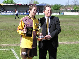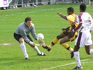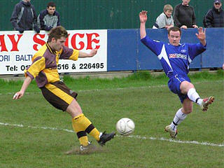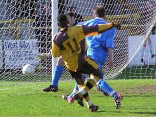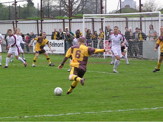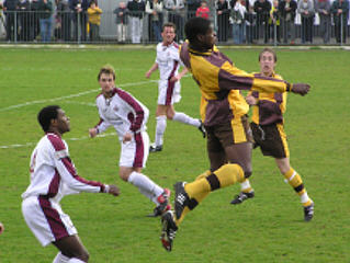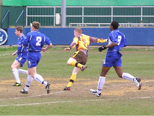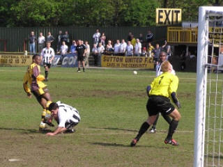 Right, Jon Nurse strikes a shot late in the game but it's deflected into the side netting. U’s v Heybridge Swifts (24/04/04) United rounded off their home league games for 2003/04 with a dominant 5-1 victory against Heybridge, who were forced to play much of the game with ten men. Matt Fowler returned to the starting line-up and, with Eddie Akuamoah nursing a couple of slight knocks, Lewis Gonsalves started as left wing back. Sutton were much the better side in the opening exchanges, Jon Nurse seeing a shot deflected narrowly wide of the right post and Nicky Bailey and Matt Fowler both striking shots at the ‘keeper before the match had reached the ten minute mark. The game was dramatically altered with only sixteen minutes gone when Neil Cousins ended a tussle for the ball with Matt Gray by petulantly kicking out at United’s Supporters’ Player of the Year. The referee had no option but to send Cousins from the pitch, and leave Heybridge facing 74 minutes with only ten men. Bailey went close to giving United the lead just after the half hour following an excellent move. Ryan Palmer played the ball up field to Fowler, who knocked it out to the right wing to Glenn Boosey. He held the ball briefly before hitting a cross field pass to Bailey, who brought it down, cut inside and struck the ball across goal with the outside of his right foot but it curled wide of the right post. The man advantage began to show as United stepped up a gear as the game approached half time. Firstly, Tobi Jinadu slid in at the back post but couldn’t divert Bailey’s free kick goalwards. Then, with five minutes of the half left, Nurse capitalised on a goalkeeping error to head the ball to Fowler, and although he could only stab the ball into the ‘keeper’s chest near the edge of the area, it rebounded kindly to Nurse who expertly lofted it over the goalie and the defenders and into the goal, 1-0. Nurse almost bagged a second on the stroke of half time but could not put enough on a header after Gray’s cross evaded all of the players in the box to reach Nurse at the back post. At the break: U’s 1, Heybridge 0. The U’s exploded out of the blocks in the second half and made the most of their chances to open a commanding lead. With three minutes gone, Nurse chased onto a Fowler header and managed to hold off a defender to reach the ball before the ‘keeper, touch it around him and then tap it home into an empty net, 2-0. Four minutes later Nurse was celebrating his first senior hat-trick for United after another excellent finish. Paul Honey won the ball in the Heybridge half, before chipping it a short distance to Nurse. He brought the ball down, dribbled infield along the edge of the area until he was level with the right post and then struck a left-footed drive low inside the right upright past a despairing dive, 3-0. Nurse left the field to rapturous applause to be replaced by Matt Hanlan and, following a missed opportunity for the visitors, Hanlan made an immediate impact on the game by netting Sutton’s fourth with 56 minutes gone. Bailey’s ball into the area was controlled and sweetly struck at goal by Fowler and, despite the ‘keeper’s save, Hanlan was in position to cut the ball in from a tight angle, 4-0. Heybridge collected a consolation goal after 66 minutes when United’s defence left Carl Griffiths free in the box to crash a volley past Andy Iga from ten yards out, 4-1. Boosey tested the goalkeeper from a deflected free kick after Bailey had been brought down but he was not to be denied his fourth goal in four games for long. With just over 15 minutes remaining, Honey battled for and won the ball on the right touchline and played it into the middle of the Heybridge half to Boosey. He darted forward with the ball, tricked his way past three defenders on the edge of the box and struck the ball left-footed past the ‘keeper and into the bottom right corner, 5-1. Within minutes Hanlan should have further increased Sutton’s lead when he skied a ball over an open goal from only a couple of yards out. JR certainly wouldn’t have found Hanlan’s miss so funny had the U’s not been so far in front. Before the game finished Fowler almost added his name to the scoresheet but could not convert a chance at the back post and was then unlucky not to win a penalty when he appeared to be blatantly tripped in the area as he ran in to convert a low cross. Final score: U’s 5, Heybridge 1. F-t-L Facts: