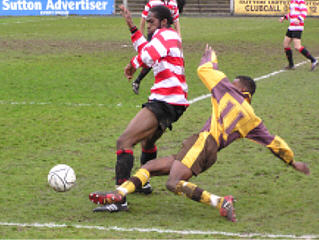 Top Right, Matt Fowler keeps the ball in play on the right wing. Bottom Left, Tobi Jinadu heads the ball on towards Matt Gray. Bottom Right, Jon Nurse flicks the ball away from Stuart Searle. U’s v Hendon (17/04/04) Sutton maintained their recent run of good form and the push for the runners-up spot in the league by beating second placed Hendon two-nil at the Lane this Saturday. Matt Fowler’s injury sustained on Easter Monday kept him out of the squad so he was replaced upfront by captain Eddie Akuamoah with Lewis Gonsalves starting at left wing back. A positive start from the Yellows saw Akuamoah go close in the opening ten minutes, hitting a bobbling shot just wide of the left post from the edge of the area. Tony Quinton also went close, heading over a Nicky Bailey corner from ten yards. Hendon had two shouts for a penalty turned down by the referee and his assistants. The second, in the 24th minute, saw their forward collide with Andy Iga as he chased a ball through the U’s defence. Iga’s slight touch on the ball may have convinced the referee that a penalty would have been the wrong decision but not so the Hendon manager, who got himself sent from the dugout by remonstrating with the referee in the following minutes. Still frustrated from the referee’s decision, United gave Hendon more to worry about after 27 minutes by opening the scoring. Matt Gray rolled the ball down the right wing to Bailey, who cut back up the wing before swinging in a left footed cross. The Hendon ‘keeper and defence failed to deal with the cross and could only knock it down to Akuamoah inside the area and he brought it from the right of the area to a central position before striking it left footed from ten yards into the bottom left corner, 1-0. Two minutes later, Glenn Boosey broke with the ball for the U’s and slid the ball to Jon Nurse on the left of the box but his low left footed drive was deflected up and over the bar by the foot of the ‘keeper. Bailey and Nurse both had chances for Sutton but it was Akuamoah who went closest to doubling the lead as the half drew to a close. Ryan Palmer started the move in defence by hooking the ball down the right wing where Paul Honey leapt to head it down to Akuamoah on the edge of the area. He held off the challenge of a Hendon defender but his shot from 18 yards struck the bottom of the left post. Hendon tested Iga in injury time with a bouncing twenty yard effort but he judged the bobble well to hold on to the shot. Half-time: U’s 1, Hendon 0. Sutton had their own penalty appeal turned down three minutes into the second period when Bailey raced onto Akuamoah’s flick and was tackled from behind just as he entered the area. Once again the referee sided with the defence but closer inspection (see photo below) confirms United players and supporters were justified in their appeal for a spot kick. The U’s kept the pressure on for the opening ten minutes and Nurse struck narrowly wide after Tobi Jinadu and Akuamoah had been involved in the build up but Hendon gained some dominance for the next ten minutes and hit the right post after 62 minutes following a run and shot from the left of the area. From the cross that followed Iga dived full length to his left to hold onto a downward header. A minute later Hendon again forced Iga into action after switching play from the left to the right left them with a man over on the right of the area but he drove the ball straight at the U’s ‘keeper who blocked the ball well. Sutton ended Hendon’s resurgence by hitting a second goal with 66 minutes on the clock. The attack started a minute earlier when Nurse crossed from the right into the path of Boosey, and although he jinked around the ‘keeper, a covering defender forced him into hitting his shot across the goal and onto the left post. After the play went out onto the right wing, Nurse collected the ball and crossed to the near post where Boosey ran in to knock the ball into the goal, 2-0. Aaron Cole-Bolt, back at United after a spell with Charlton and on as a substitute for Akuamoah, hit a first time shot over the bar from the edge of the area with fifteen minutes remaining before Iga denied a Hendon forward with an outstretched leg. Bailey should have sealed the victory for United with 83 minutes on the clock but after bringing a long ball under control with one touch from his left foot, he prodded the ball past the goalie and the right post with a right-footed effort. Boosey and Matt Gray both had very similar shots saved as the game reached the final minutes and Nurse also stretched the visitor’s defence but saw his effort deflected into the side-netting. Final score: U’s 2, Hendon 0. F-t-L Facts: