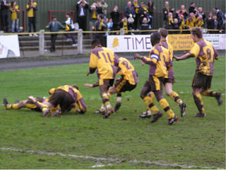 Right, United players mob Glenn Boosey after his wonder-goal. U’s v Carshalton Athletic (12/04/04) Sutton’s winning run came to an end at Colston Avenue but the U’s did at least manage to come back from two early goals to earn a draw. Glenn Boosey’s substitute performance against Kingstonian earned him a start in place of Jesper Nielsen but elsewhere the team was unchanged. Nicky Bailey went close to opening the scoring after only three minutes when Matt Gray played his short corner back to him and Bailey hit a hard shot from the corner of the area but the ball was palmed away from the top right corner by the diving ‘keeper. Despite playing the best football Sutton were two goals down before the game was ten minutes old. First, with seven minutes on the clock, a corner from the left to the near post was flicked on and drifted in at the back post, 0-1. Two minutes later the hosts doubled their lead when Andy Iga claimed a cross under the bar and was bundled into the back of the net when off balance. The linesman flagged to say the ball had crossed the line but the goal should arguably been disallowed for the shove on Iga that forced him to carry the ball into the net, 0-2. The two goals, both against the run of play, marked the end of any attacking chances that the Robins had, as United began to lay siege to their opponents’ goal. Within minutes of the second goal, Boosey almost halved the advantage but his strike from the edge of the area was deflected only a yard wide of the right post. In the next attack Boosey was involved again as his run to the edge of the area set up a chance for Gray but his curved effort from twenty yards was dealt with by Stuart Searle, who dived to push the ball away. Sutton kept their foot on the gas and with still only twenty minutes gone went close again. After Jon Nurse won the ball on the right wing, he played the ball down the line to Paul Honey, who held off the challenge of one man before whipping a cross over to the back post where Bailey headed into the side netting. Carshalton’s desperate resistance was finally broken four minutes later when Matt Fowler switched the play from the left wing over to the right. Tony Quinton controlled the ball and laid an angled cross into the box which was met by a powerful header from Bailey that crashed past Searle into the right side of the goal, 1-2. Buoyed on by reducing the deficit, the U’s came at Carshalton again and Bailey’s perfectly weighted pass carved open the Robins’ defence and fell right into the path of Gray’s run but, as the ‘keeper came out, Gray knocked the ball both over him and the bar. Just after the half hour, Bailey nearly scored a brilliant solo effort. Collecting the ball inside his own half, Bailey sped past one man on the half way line and ran full-pace from the right wing to the edge of the area where he cut inside from the right towards the centre of the box before unleashing a left-footed drive that screamed past a crowd of Carshalton defenders but cannoned back off the top of the left post. Bailey was controlling the game from the United midfield, and was involved in virtually every Sutton attack. His ball up to Fowler in the 38th minute was brought down by the U’s striker and played to Gray but his shot from ten yards was first blocked by Searle and then just eluded Fowler as he stretched to prod the rebound home. Sutton’s attacking play was continually too quick for the Robins, who resorted to trying to kick United’s players off of the pitch. After a cynical foul on Gray as he broke down the right wing, Bailey’s free kick was headed goalwards by Nurse but pushed away by the goalie and cleared behind for a corner. Five minutes before the end of the half, Quinton, presumably injured, left the pitch to be replaced by Martin Dunne – a like for like swap in terms of position. With only a minute remaining, Carshalton’s dirty play was finally punished when their number five was sent from the pitch – his late, knee-high challenge on Bailey rightly earning him a second yellow card and an early bath. A deluge of corners as the half came to a close brought a number of chances for the U’s, the best falling to Ryan Palmer but his effort was blocked by a wall of defenders. Half-time: U’s 1, Carshalton 2. Dean Hamlin replaced Fowler as the second half began, with Gray moving up front so that Hamlin could slot in at right wing back. The second period began as the first had ended, with the Yellows controlling the game and producing wave after wave of attack on the Carshalton goal. Six minutes in, Nurse collected a long ball from Bailey and struck a right footed shot from twenty yards only for it to be deflected behind. The resulting corner found Boosey in space on the edge of the penalty area but his sweetly struck drive was palmed away. In the next attack Nurse looked to be taking a free kick on the left corner of the area but Gray rolled the ball into the centre to Bailey and his effort, heading wide of the right post, was met 12 yards out by the foot of Palmer but he could only guide the ball past the left upright. A high foot ended the game for Honey after 66 minutes when an attempted bicycle kick caught him above the eye and he was replaced by Lewis Gonsalves. Eddie Akuamoah took Honey’s position in midfield and Gonsalves came on at left wing back. As the match entered the final twenty minutes, United continued their unrelenting search for an equaliser. Dunne’s cross-field ball was touched on by Akuamoah to Bailey on the left wing and he drilled a ball across the area that reached Nurse on the far side but he put his first time shot over the bar as he leant backwards. Hamlin’s cross from the right after Boosey had won the ball in the corner was almost converted at the back post by Gonsalves and Nurse but when the ball was half-cleared it fell to Akuamoah on the edge of the area and he forced a diving save from Searle. As it began to look like United