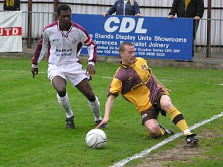 Right, Paul Honey crosses into the box. U’s v Kingstonian (10/04/04) United broke a post-war record at the Lane on Saturday with a 4-1 demolition of the K’s. When Glenn Boosey scored the goal of the season in the 72nd minute he extended Sutton’s run of games in which they’ve scored at least three goals to seven games. The record breaking game began with only one change to the U’s line-up – Jesper Nielsen starting in place of Chris Nurse, who began a four game suspension. Sutton dominated the early proceedings, and went close to scoring twice as Kingstonian struggled to deal with United’s corners. Matt Gray should have done better with ten minutes gone but miss-hit a low pass from Ryan Palmer after the central defender had collected a corner that had sailed over the box. Two minutes later the Sutton forwards almost bundled the ball across the line following a corner from the left. The Ryman officials kept up their recent standard of refereeing by denying United a blatant penalty with 16 minutes on the clock. A long ball over the top of the defence was chested down by Nicky Bailey and when he tried to cut the ball back to Jon Nurse the ball clearly struck the hand of a sliding defender and deflected away. The U’s didn’t break stride after missing out on the penalty and took the lead in the 20th minute. Tobi Jinadu curled a pass down the left wing and Nurse outran the first defender before cutting into the area. He passed the ball past the final defender and into space to Matt Fowler, who met it with a first time left-footed shot that found the back of the net via the bottom of the right post, 1-0. Nurse should have doubled the lead shortly after when Bailey beat two men and rounded K’s ‘keeper, Lance Key, and then knocked the ball back from the touchline into the six yard box but although Nurse was first to it, a Kingstonian defender somehow managed to get between him and the goal and deflected the ball across the line and behind for a corner. Kingstonian could have pulled level eight minutes before the break when one of their forwards capitalised on a defensive error to be left one on one with Andy Iga but Sutton’s shot-stopper managed to force him wide and the eventual shot was hit into the side netting. Sutton made the visitors pay for their missed chance by scoring a second goal two minutes later. Nurse was first to a ball over the top of the K’s defence and, after bringing the ball under control, slammed a left-footed drive from the edge of the area into the bottom left corner of the goal. Half-time: U’s 2, Kingstonian 0. United’s lead was reduced in fortuitous circumstances straight after the break when Mark Beard’s weak shot from the edge of the area deflected off of a United player into the left side of the goal after Iga had already dived in the opposite direction, 2-1. Tony Quinton almost made an immediate reply for Sutton but his first time effort from Bailey’s corner was tipped around the post by Key. After a lull in the game for ten minutes, it exploded back into life with the introduction of Boosey for Nielsen in the 69th minute. Having been on the pitch for a mere 3 minutes, Boosey began U’s record-breaking goal by collecting the ball ten yards inside the K’s half and running towards the area. He beat one man before he reached the edge of the box and then twisted past two more as he broke into the area. As two defenders and the ‘keeper closed in, Boosey turned and switched the ball to his right foot and left all three of them lying on the grass. With the goal at his mercy he then kept his head to pass it into the right side of the goal, past the hand of Key who had tried desperately, but in vain, to reach the ball, 3-1. The goal deflated any spirit Kingstonian might have had and Gray sealed the victory with 78 minutes gone with another brilliant goal. Jinadu took a freekick from United’s half and played it short to Palmer, who hit a long ball up towards the K’s area. Gray sprang through the offside trap and as the ball dropped just inside the penalty area he looped a header over a stranded Key, who could do nothing but watch the ball sail over him and fall into the goal, 4-1. With a minute remaining Sutton almost added further to the scoring but Gray could only place Bailey’s blasted free-kick wide of the left post. Full-time: U’s 4, Kingstonian 1. F-t-L Facts: