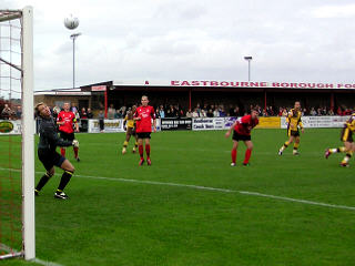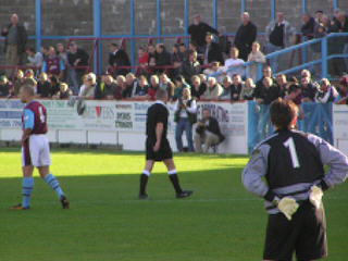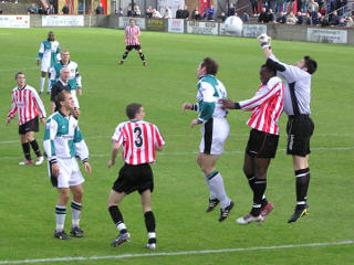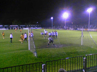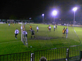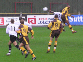 Right, United's players await a corner from the right. U’s v Bishop's Stortford (23/10/04) United are still looking for their first home win of the season and remain in the relegation zone after this goal-less draw. With Paul Honey, Scott Corbett and Craig Watkins all picking up injuries against Bromley, Nigel Brake returned to the starting eleven at left wing back and striker Warren Haughton went straight into the side, having signed on loan from Lewes on Friday. The strong wind and driving rain conspired to produce a dire opening half hour, in which chances were few and far between. United were restricted to hopeful long shots, Eddie Akuamoah hitting a 25 yarder straight at the ‘keeper and Peter Fear hammering a free kick narrowly over from 40 yards. After 34 minutes, Sutton should have taken the lead when Haughton missed a glorious opportunity to cap his debut with a goal. Matt Gray and Glenn Boosey took a corner from the right and it fell nicely to Haughton in the six yard box but he flicked it wide of the right post with the goal at his mercy. The let off seemed to awaken Stortford who nearly capitalised on a defensive error by Tony Quinton but Phil Wilson produced a sublime diving stop and shortly afterwards he easily held a long shot that skimmed through off the rain-soaked Gander Green Lane pitch. Half-time: U’s 0, Bishop’s Stortford 0. United started the second half well and forced a corner when a run from Lewis Gonsalves and an intelligent through ball set up crossing chances for Brake, and then Gray, who collected the first effort on the far side before seeing his curled ball cleared behind. Sutton worked the corner to Boosey around ten yards out in the area and when his shot span off a defender and towards goal, Andrew Martin reacted first to slide it home only for the linesman to raise his flag for a dubious offside. Sutton’s defence continued to look suspect and the visitors could have scored twice in two minutes before the hour mark but first an angled ball through the area just missed the slide of their striker and, a minute later, Wilson fumbled a headed effort but United scrambled it clear from the six yard box. With fifteen minutes to go Stortford had the best chance of the game when Wilson brought down an attacker in the area to concede a penalty but he then made amends for his error by diving to his right to palm Dave Rainford’s spot kick away. The final ten minutes of the match saw the game swing from end to end with Quinton involved twice as he first tackled on the edge of the U’s area to prevent a scoring chance and then headed just over from a Matt Gray corner. Minutes later, Wilson was in action again, blocking with his legs after a break down the middle of the pitch had opened up the Sutton back line. From the save, Akuamoah launched a counter attack, eventually laying in Martin whose effort rebounded off the ‘keeper to Akuamoah outside the box and his chip to the back post just eluded Haughton. In injury time Stortford looked the most likely to score but were denied by an excellent double tackle inside his own area from Gonsalves as the game finished with the points fairly split. Final score: U’s 0, Bishop’s Stortford 0. F-t-L Facts: