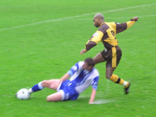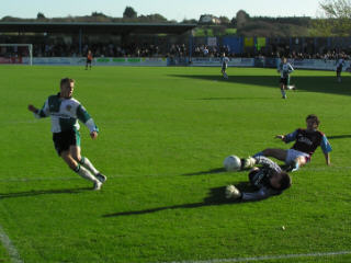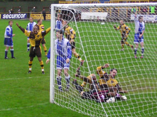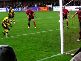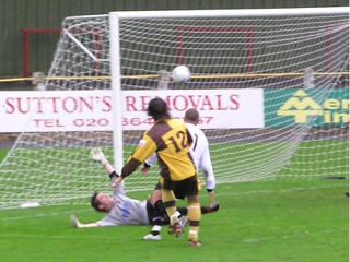 Right, Andrew Martin slots home Sutton's second. U’s v Bromley, FA Cup 3rd Qual. Round Replay (20/10/04) United crashed out of the FA Cup at Bromley but were again guilty of squandering a lead as Bromley battled back from a Peter Fear goal. John Rains made only one change from Saturday’s first game, bringing Glenn Boosey into midfield and moving Eddie Akuamoah to left wing back at the expense of Nigel Brake, who dropped to the bench. Andrew Martin nearly set Sutton going with a dream start when he received the ball from Tony Quinton and span past his man outside the area but he curled his left-footed shot across the goal and wide of the left post. The U’s were denied a penalty when Akuamoah appeared to be bundled over but took the lead moments later. After sixteen minutes, Boosey went on a winding run before laying it off to Martin, who was clattered around 25 yards out. Fear’s first free kick was blocked by the wall but the referee ordered the kick to be retaken, ruling that the defence were not ten yards. The second time round Fear’s shot was much sweeter, curling around the wall and into the top left corner, 1-0. Amazingly, having looked the better side in the early exchanges, Sutton then made exactly the same mistake as they did in Saturday’s match, letting their guard down and taking the foot off the pedal. Within ten minutes Bromley had gone close twice, first shooting over the bar and then drawing a save out of Phil Wilson, who tipped over. Sutton almost benefited from a defensive error to extend their lead with half an hour gone when Boosey crossed from the left and a Bromley defender misguided his headed clearance straight towards his own goal but the ‘keeper reacted quickly to dive to his left and hold the ball. Bromley’s ‘keeper again prevented a second Sutton goal as the half entered its final five minutes. Matt Gray launched a counter attack down the right wing and outpaced two defenders before crossing deep to the back post where Boosey headed towards goal only for the ‘keeper to fling himself through the air and block the shot behind for a corner. Having seen a couple of chances go begging, United were stunned when the hosts equalised with two minutes of the half remaining. A foul on Scott Corbett by the Bromley ‘keeper went unpunished and with the U’s momentarily reduced to ten men as Corbett sought treatment on his foot, Bromley went on the attack and won a corner. The dead ball was only half cleared to the edge of the area where Solomon Taiwo hit a shot that deflected wildly off a United defender and past Wilson, 1-1. It went from bad to worse for Sutton, though, when deep in first half stoppage time, former U Danny Arkwright met a corner from the left and headed past Wilson to give Bromley the lead. Half-time: U’s 1, Bromley 2. After the break, Bromley’s game plan was clearly to slow the game down and hold on for the 2-1 victory and their quick closing down frustrated United and restricted goal scoring chances to a minimum despite the amount of possession Sutton had. United’s best chance fell to Craig Watkins when Boosey jinked past a man and played him in for a one on one with the ‘keeper but Watkins struck straight at him and the shot was palmed away to safety. Quinton and Martin both went close before Sutton began to get increasingly desperate as the game approached the final fifteen minutes. Boosey tried an audacious lob from 35 yards but with the ball dropping right on top of the bar, the Bromley ‘keeper just reached back to tip if behind. A minute later Paul Honey crossed to the penalty spot and Quinton slammed a volley at goal but it went straight at the ‘keeper and he held without trouble. Brake was introduced for the injured Watkins and nearly created a Sutton equaliser on two occasions, first seeing his cross roll right across the goal line and then pulling a cross back to Honey in the area only for a defender to pip Honey to the ball and knock it to safety. With the game as good as over, Sutton threw everyone forward for a Fear free kick and he played it long into the Bromley box where Scarborough met it near the right post and headed downwards at goal but it was scrambled off the line and the referee soon blew his whistle to signal United’s exit from the cup. Final score: U’s 1, Bromley 2. F-t-L Facts: