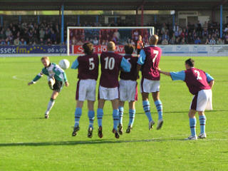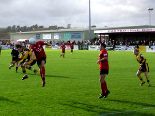 Sutton booked their spot in the next round of the FA Cup in a seven-goal thriller at Eastbourne. Injuries to both Andy Iga and Phil Wilson forced John Rains to play 41 year-old Chris Vagg in goal. The only other change saw Tony Quinton return from injury to play in midfield, with Scott Corbett dropping into the back three. Joff Vansittart missed out through suspension. The U’s started the game positively and a fluid passing move involving Eddie Akuamoah, Peter Fear, Craig Watkins and Nigel Brake tore apart the Eastbourne defence but failed to create a clear-cut scoring opportunity. Within minutes, Andrew Martin won a corner on the left and Quinton nodded the resulting dead-ball just over the bar. United’s emergency ‘keeper was tested after ten minutes when an Eastbourne forward tried his luck from thirty-yards but Vagg was equal to the effort, stepping to his left and holding the shot comfortably. With nineteen minutes gone, Sutton ensured there would be more goals than August’s nil-nil bore draw at Gander Green Lane by claiming the lead. Following a foul on Matt Gray in the middle of the Eastbourne half, Fear took the free kick and hit it low to Gray on the edge of the area. He took one touch before returning the ball to Fear who chipped a ball into the box where Watkins guided a header over the ‘keeper from just inside the box, 1-0. Sutton continued to control the game and Watkins almost bagged a second shortly later but, after winning the ball on the right wing and spinning off his man, his shot from the edge of the area was saved by the ‘keeper, who dived low to his right to claim the ball. Nearing the half hour the U’s went close again. Brake kept the ball in on the left wing and, when all the defenders stopped to appeal for a throw in, Brake ran without challenge into the area and struck a low ball across the face of the goal that just eluded Watkins in the middle. Gray retrieved the ball on the right wing but his cross was volleyed over by Quinton. The hosts equalised against the run of play with thirty-two minutes on the clock. A free kick thirty yards out, given harshly against Akuamoah for handball, was laid to Stuart Tuck, who advanced five yards before hitting a hopeful shot that deflected wildly off Brake and flew into the top left corner of the goal, 1-1. Seven minutes later, Eastbourne took the lead. After a chipped ball into the box, Sutton’s defence appealed in vain for a handball and, in the ensuing scramble for the ball, Scott Ramsay was able to knock it past Vagg, 2-1. The U’s responded positively and could have been level before half time when Akuamoah broke with the ball from the half way line but he was brought down from behind as he raced towards the area. Fear took the free kick and Quinton won the header but could only put it straight at the ‘keeper. Half-time: U’s 1, Eastbourne 2. Sutton always looked like they had another goal in them as the second half began and had to wait only ten minutes to be level. Fear found Gray on the right and he beat his marker and drilled in a low cross that caused a scramble for the ball on the edge of the six yard box that ended when Akuamoah knocked the ball goalwards and a defender miscued his clearance into the roof of the net, 2-2. Gray’s skill was frequently too good for the left back and he was scythed down during Sutton’s next attack. Fear could not make the most of the free kick and his curled effort was easily held by the goalie. The U’s could not stay level for long, though, and found themselves behind for the second time only eight minutes after the equaliser. John Scarborough was adjudged to have fouled an Eastbourne forward just inside the area and Ramsay despatched the spot kick to the left of Vagg, 2-3. It was only two minutes before the game was all square again. Watkins reacted quickly to touch the ball away from a defender and into space on the right side of the area and then placed a pass perfectly into the path of Martin who side-footed the ball under the goalkeeper from eight yards out, 3-3. Sutton began to push for a fourth and almost found it within minutes when Akuamoah and Watkins combined to work the ball to Martin inside the area but his shot rebounded off the bar. United were now looking as if they would score on every attack and, with twenty minutes remaining, found the net for the fourth time in the game. Martin played the ball wide to the right where Watkins crossed into the box and Martin, who had continued his run into the area, jumped and headed the ball inside the right post, 4-3. Martin could have had his hat-trick three minutes later as Sutton threatened to overrun their hosts. Watkins, in a central position just outside the area, played the ball to the right to Fear. He controlled the pass and, as two defenders approached, flicked it between them back to Watkins who now had a clear run on goal. As the ‘keeper came out to save, Watkins unselfishly passed it to the left to Martin, who twisted past a man and shot low at goal with his right foot only for a defender to have got back and clear off the line. With Watkins tiring, Paul Honey came off the bench to make a welcome return from a foot injury that had kept him out of United’s last few games. Sutton continued to dominate and could easily have scored a couple more before the game ended. Brake went close on two occasions after finding space on the left wing and Quinton nearly scored a spectacular effort when he jinked past a defender twenty five yards out and hit a firm drive that went narrowly high of the right angle. As the game reached its conclusion, Eastbourne came close to a dramatic late leveller but a header from within the area, following a number of crosses, dropped on top of the bar and was finally cleared from danger. Final score: U’s 4, Eastbourne 3. F-t-L Facts: