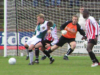 Top Right, Eddie Akuamoah watches his effort before it is put in the net by a defender, 2-2. Bottom Left, Andrew Martin side-foots home the third goal. Bottom Right, United go 4-3 ahead as Andrew Martin heads in from ten yards. U’s v Hayes (09/10/04) After last weekend’s win in the FA Cup against Eastbourne, United desperately needed to carry some form into the league and pick up three points away to Hayes. A disappointing performance, though, was compounded when Hayes scored late on to deny the U’s any points and leave them in the relegation zone. Just when it looked as if Sutton were going to have done enough to earn a point, a Hayes break away lead to a free kick being harshly awarded against John Scarborough on the edge of the U’s box. It was touched sideways to Josh Scott and his low driven effort went through a crowd of players to beat Phil Wilson with only three minutes of the game remaining. Hayes had started the game better, dominating the early possession and preventing United from having a shot on goal in the first half. With five minutes gone, the hosts almost grabbed the lead when a cross from the right wing caught in the wind and looped over Wilson but came back off his bar. Three minutes later, United’s shot-stopper was back in action, palming away at head height a rasping shot from the edge of the area. After their early chances, Hayes were far from inspirational themselves but had the better of some bizarre refereeing decisions, including penalising Wilson for picking up a back pass that looked far from intentional. They were unable to capitalise on the opportunity, however, as Sutton’s wall charged out to block the free kick. United’s midfield passed the ball nicely at points, Tony Quinton and Peter Fear combining well on a number of occasions, but they were unable to break the Hayes defence down, even when Matt Gray and Nigel Brake got forward to support down the wings. The half ended with Wilson producing an excellent double save, blocking the first effort at the feet of the striker before saving the rebound. Half-time: U’s 0, Hayes 0. Sutton were much better in the second half and finally produced a noteworthy chance early on when Scarborough played a free kick long into the Hayes area and Gray headed it towards the penalty spot where Craig Watkins flashed a volley wide of the right post. Hayes continued to look capable of scoring but were hampered by their lacklustre finishing. After Wilson dived at the feet of a striker to save again from close range, another chance minutes later was spectacularly wasted when it was blazed high over the bar and out of the ground from inside the area. United’s aspirations for taking the lead were being similarly quashed by an inability to hit the target. A four minute spell just after the hour saw the U’s miss three chances – Watkins went close twice, first catching the defence out to beat the ‘keeper to the ball but flicking it wide and then seeing a shot blocked by a defender after Quinton drifted a ball into the area. Andrew Martin also narrowly missed, striking a shot from the right side of the area just high of the right angle after Watkins had won the ball on the left and played it across the pitch to him. Finally, with twenty minutes remaining, Sutton forced a save from ex-U Kevin Davies for the first time when Scott Corbett curled a free kick from wide on the left towards the top left corner but Davies was equal to it. Sutton looked more threatening in the final fifteen minutes, Corbett and Watkins both chancing shots from outside the area that failed to find the target. But United’s increased attacking impetus created space at the back that Hayes continuously looked to exploit, and did so with minutes to go, breaking on a counter-attack following an unpenalised foul on Corbett, to earn the dubious free kick from which Scott scored, 0-1. Gray nearly salvaged a point for the U’s in a last desperate attempt to score when he broke clear of his marker on the right wing and ran into the area but his drilled effort was tipped around the post. Final score: U’s 0, Hayes 1. F-t-L Facts: