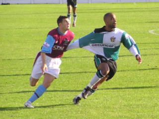 Right, Joff Vansittart loses out in the air to former U, Kevin Davies. U’s v Bromley, FA Cup 3rd Qual. Round (16/10/04) Sutton threw away a two-goal lead at a rain-swept Gander Green Lane on Saturday and will now need to win a replay at Bromley on Wednesday night if they are to progress further in the FA Cup this season. It had all started positively for the U’s when they took the lead with only three minutes gone. Matt Gray was fouled on the right wing and John Scarborough headed Peter Fear’s free-kick just inside the right post from the edge of the area for his first goal for the club, 1-0. United controlled the early stages of the game and could have added another after twelve minutes. Joff Vansittart flicked a long ball beyond the defence and Craig Watkins outpaced the defence to leave him with only the ‘keeper to beat but shot into his legs from eighteen yards. An injury to Vansittart saw the introduction of Andrew Martin and he doubled United’s lead within two minutes of coming on. Matt Gray’s throw-in was cleared to Fear just outside the area and he played it back out wide to Gray, who swung a dangerous ball through the box that found Martin unmarked at the back post. He had time to bring it under control before shooting left-footed over the ‘keeper and into the goal, 2-0 (25 minutes). Three minutes later, the U’s should have put the result beyond doubt but Watkins was again unable to capitalise on his explosive pace when he raced on to a through ball but shot at the ‘keeper. Having been the better side, Sutton made the mistake of taking the foot off the pedal and Bromley began to work their way back into the match, sharing possession equally and forcing the U’s into a number of desperate clearances. Then, with a minute of the half remaining, United gifted Bromley a goal when a left-wing corner was headed into the top-right corner of his own goal by Tony Quinton. Half-time: U’s 2, Bromley 1. Five minutes after the interval Bromley were level when Colin Luckett curled a left-footed, twenty-five yard free-kick around the wall and into the right of the goal, just out of the reach of Phil Wilson, 2-2. Bromley remained the better side for virtually the whole of the second half and would have booked their spot in the next round but for some wasteful finishing. Just before the hour, Wilson raced out of his area but was pipped to the ball by the striker who knocked it past him and goalwards. Gray intervened to stop the ball crossing the line but slipped trying to make a clearance and gifted an opportunity to a Bromley forward who shot into Gray on the floor and then blazed the rebound over. The balance of the game was thrown further in Bromley’s favour when Sutton were reduced to ten men with twenty minutes of the half gone. Watkins appeared to be wrestled to the floor just inside the area but, following the ensuing melee for the ball, the referee consulted his assistant and produced a red card for Martin, apparently for treading on a Bromley player. As the U’s hung on for the draw, the visitors had a couple of chances to win the match but were first denied by a fantastic one-on-one save from Wilson and, four minutes into stoppage time, beat Wilson but were stopped from scoring by Scarborough who slid in six yards out to win the ball when the goal was open and prevent United’s exit from the cup. Final score: U’s 2, Bromley 2. F-t-L Facts: