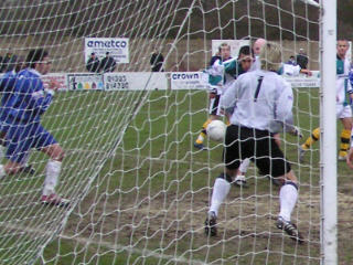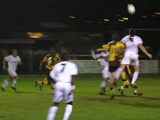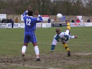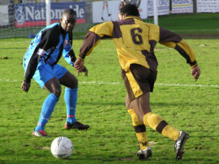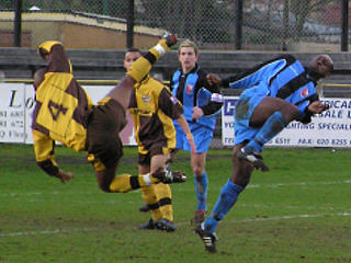 Right, Nigel Brake attacks the Hayes right back. U’s v Margate, (19/02/05) United picked up a point in a game that looked every bit like two teams struggling to stay safe from relegation, but could have won if some late pressure had brought a second goal. In a tame first half, the U’s were by far the more active in front of goal as Margate seemed content to lump the ball long down the pitch – a tactic that proved fruitless due to the bitter wind that saw each high pass blow straight through to Phil Wilson in the United goal. Eddie Akuamoah and Craig Watkins were paired upfront for the U’s as Joff Vansittart completed his two-game suspension. Both were unlucky not to break the deadlock after only ten minutes as Margate’s defence hesitated in clearing from their area but neither of the U’s strikers could force the ball across the line before it was knocked away for a corner. Watkins was the more threatening of the Sutton front two and perhaps should have tested the ‘keeper fifteen minutes later when Scott Corbett tapped a pass onto him but his fierce left-footed strike from the edge of the area went high and wide of the left angle. The U’s dominance was finally rewarded with ten minutes of the half remaining. Nigel Brake struck a high corner from the right towards the penalty spot where John Scarborough sent an overhead kick towards goal. Scarborough’s effort didn’t appear to have the power to cause any trouble to the score line but Watkins was in the right place at the right time to help the ball into the back of the net from three yards out. Half-time: U’s 1, Margate 0. Margate dominated the opening exchanges of the second half and were denied a leveller twice in quick succession soon after the restart as, first, Tony Quinton cleared from the Sutton goal line and, then, Wilson saved a one on one chance. United struggled to find any rhythm to their play but produced some good chances nonetheless, notably Lewis Gonsalves firing across goal after Scarborough and Brake had combined to create a scoring opportunity from the left of the area. The hosts defence was tormented by Watkins all game and he very nearly doubled the U’s lead with fifteen minutes left but his Rooney-esque lob from forty yards came down the wrong side of the post and hit the side netting. With ten minutes to go, Margate grabbed the equaliser that they would have felt their play merited. A period of intense pressure was capitalised on by Darren Watson, who jumped highest to head home from a right wing free kick, 1-1. Sutton pressed forward in the final five minutes but were denied a winning goal by some inept refereeing as much as the dogged Margate rearguard. Akuamoah’s cross from the right of the area was clearly prevented from reaching the middle by an opponent’s hand but neither the referee nor his assistant had the nerve to award Sutton a potential match-winning spot kick. Then, a minute into injury time, Akuamoah surged towards the Margate area and was impeded a step into the box by a clumsy waist-high challenge that sent him crashing to the floor. Once again, the referee failed to punish the Margate defence, bizarrely awarding the U’s an indirect free kick outside the area. The opportunity of a dead ball on the edge of the box nearly proved enough for United but when the ball broke for Chris Nurse his shot rattled the left post and Corbett was flagged offside as he closed in on the rebound. Final score: U’s 1, Margate 1. F-t-L Facts: