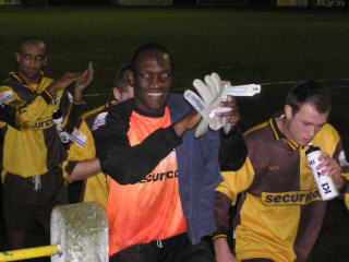 Right, Sutton's players clap their fans after the game. U’s v Hayes, (12/02/05) United slipped closer towards the relegation zone as Hayes left Gander Green Lane with all three points on Saturday. Romauld Bouadji returned to the back after being ineligible for the Woking match and Tony Quinton also started, having made a substitute appearance in the Surrey Senior Cup. Joff Vansittart’s suspension saw Craig Watkins and Eddie Akuamoah begin up front. Sutton began positively and Nigel Brake could well have volleyed the U’s into an early lead but side-footed over at the back post after good work by Paul Honey had released Matt Gray to cross from the right wing. The visitors had the benefit of playing with the ferocious wind in the first half and nearly exploited it to maximum effect on two occasions with curling balls into the box that were caught by the wind. Phil Wilson showed good command of his area, though, to deal with the danger. Despite Hayes perhaps having more of the possession, it was the U’s who went closer to scoring. Watkins utilised his explosive pace to leave his marker trailing on the halfway line before firing wide of the left post from twenty yards. Then, on the half hour, John Scarborough brought down a Peter Fear long throw and volleyed acrobatically at goal, only for former U’s ‘keeper Kevin Davies to somehow keep it out with a combination of glove and boot. Hayes grabbed the lead with thirty-eight minutes gone, dashing Sutton’s hopes of reaching the break level after playing against the elements. Wilson saved well from ten yards but the rebound was sent back towards the goal line where Jon Dyer turned the ball past two United defenders, 0-1. The U’s responded well to the goal, passing the ball around nicely as they patiently looked for a breakthrough. With the half practically over, Watkins hooked a ball towards Akuamoah and he raced clear of Hayes’s centre back but blew the chance to equalise, firing wide of the left post with only the ‘keeper to beat. Half-time: U’s 0, Hayes 2. Only six minutes after the interval, Hayes doubled their lead and it was Dyer who found the net for the second time in the match, shooting into the bottom left corner after Wilson had saved his first effort, 0-2. John Rains introduced Scott Corbett for Danny Dray and switched from 4-4-2 to 3-5-2 in an effort to get back into the game and it nearly paid immediate dividends as Fear flicked a neat ball through to Akuamoah but he shot across the goal and wide of the right upright from eighteen yards. Some sloppy defending seemed to put the result beyond doubt after 66 minutes when Hayes found the net for the third time. A corner from the right reached Dyer unmarked six yards out and he volleyed into the goal to complete his hat-trick, 0-3. But Sutton refused to go down without a fight, and pulled a goal back only three minutes later. Fear’s free kick was deflected behind for a corner from the left and Gray’s swirling corner curled beyond the goal line, 1-3. United’s fans were soon hoping for an amazing comeback when Corbett reduced the lead further with fifteen minutes still to play. Fear’s long throw from the right went through the area and Corbett lashed a fierce shot into the top left corner from twelve yards, 2-3. The U’s pushed forward in search of a leveller and, after Watkins’s hopeful strike from the edge of the box was comfortably saved, Fear should have hit the back of the net with four minutes to go but knocked the ball over the bar when Watkins’s deep cross from the right dropped to him at the back post. And, with two minutes left, United’s attacking impetus left the space at the back that Hayes needed to score a fourth and secure the points. Peter Dean came into possession on the left side of the area and, with no defenders around him, had time to control the ball before striking a shot through Wilson. Final score: U’s 2, Hayes 4. F-t-L Facts: