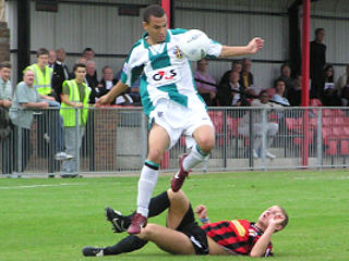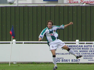 Right, Matt Gray hits a long clearance from the right back position. U’s v Farnborough (27/08/05) United battled for a one-nil one at Gander Green Lane on Saturday, despite being without Craig Watkins, who has joined Exeter, and Luke Cornwall, scorer of five league goals in the first three games of the season, who missed out through injury. In their places, John Rains fielded two new signings – Jamie Mackie, a former MK Dons striker, on loan from Exeter and Ali Chaaban, previously with Farnborough and Exeter. Mackie made a positive start to his spell at the U’s, showing some neat touches around the box that paved the way for a Matt Gray cross to be deflected narrowly over the bar. Shortly later, Mackie was alert to a poor back pass and nipped in front of the ‘keeper to take the ball from him but passed the ball behind Eddie Akuamoah when he attempted to pick him out on the edge of the box. Farnborough shared equal amounts of possession in these early stages and made Carl Emberson work with a twenty yard snap-volley that United’s experienced ‘keeper held above his head at full stretch. With twenty-nine minutes on the clock, United scored what proved to be the only goal of the game. Chaaban and Lewis Gonsalves combined to find Tony Quinton in the middle of the ‘borough half and he swept the play out to the right to Gray. With one touch Gray brought the ball down and then struck a sweetly curling cross that the ‘keeper misread, allowing it to sail over his head. Chabaan collected the ball just beyond the far post and crossed back to the middle where Mackie headed home from barely a yard out, 1-0. In a quiet end to the half, neither side threatened much to add to the scoring, Mackie coming closest with a shot from the edge of the box that went wide of the left upright. Half-time: U’s 1, Farnborough 0. After the break, United contained the Farnborough attacks well until late on but failed to make much of an attacking impression as a result. Quinton twice failed to hit the target after good work from Mackie and Chaaban. In the final minutes, Sutton were forced into a backs-to-the-wall defensive effort to protect the one goal lead. Farnborough should have made more from a right-sided corner but their player headed wide at the back post. Then, with a minute to go, an attack down the right side produced a deep cross that sailed over Emberson but was hooked away from danger by Gray. In injury time ‘borough went the closest they had come to finding an equaliser when their forward ran across the edge of the box and then hit a shot from just right of centre that left Emberson helpless but cannoned back off the left post. As the game reached its conclusion the U’s were unlucky not to pick up a penalty when Mackie was clearly shoved in the back inside the area but barely had time to complain before the referee’s whistle ended the game and signalled a fourth win from four matches and a third consecutive clean sheet. Final score: U’s 1, Farnborough 0. F-t-L Facts: