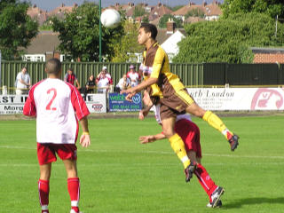 Right, Lewis Gonsalves jumps to head the ball upfield. U’s v Dorchester (29/08/05) United maintained their one hundred percent record with what turned out to be a comfortable victory against Dorchester. Steve Douglas, who had been on holiday earlier in the season, took the place of Ali Chaaban in attack but otherwise the team remained unchanged from Saturday's victory against Farnborough. In an uninspiring first half, neither side had many opportunities of note until the game was lit up by a moment of magic from Douglas on the stroke of half-time. Matt Gray was heavily involved for the U's, crossing from the right for Sutton's first two opportunities but despite two excellent crosses the U's failed to hit the target on either occasion, both Tony Quinton and Jamie Mackie being guilty of missing the goal. Dorchester were marginally the more threatening side up front, producing a flowing move early on that was glanced wide at the near post and then finding Carl Emberson in fine form as he saved a downward header from a corner. But, on the whole, they struggled to convert their attacking possession into goalscoring chances. In injury time at the end of the half, Gary Elliott made a superb sliding tackle to prevent a shot just inside the area and from that United went on the attack. Having won a throw on the right wing, deep in the Dorchester half, Gray threw the ball to Quinton, who span around his marker and curled a right foot cross into the middle where Douglas connected with a bicycle kick near the penalty spot that flew into the left side of the goal, leaving the 'keeper no chance. Half-time: U's 1, Dorchester 0. Both sides could have added to the scoring at the start of the second half before two moments of madness from Dorchester players changed the game in United's favour. After 64 minutes a two-footed tackle on Jamie Mackie on the right by Scott Morgan brought about a red card for the Dorchester player when he followed up his outrageous tackle by aiming some ‘foul and abusive’ language at the referee. Within two minutes, Dorchester were down to nine men when Gray received the ball and attacked the box from the right wing but was scythed down by Simon Radcliffe, who earned himself a second yellow card. Sutton dominated the game from then on, making the extra men count as they went on the attack time and time again. The match was effectively over when Sutton took a two goal lead in the 69th minute. Gray chipped a ball over the defence that sent Mackie free on the right side of the box and he showed great strength to hold off a defender and poke the ball right-footed under the ‘keeper and inside the near post, 2-0. The third goal followed only seven minutes later as Paul Honey passed to Quinton, who took the ball to the edge of the box before sliding an angled pass to the right of the area to Gray and his low, drilled cross was converted at the back post by Eddie Akuamoah, 3-0. United looked capable of scoring on every attack as they used the extra space to tear apart the Magpies defence. Quinton was involved again in bringing the ball from the middle of the pitch, this time rolling a through ball to Mackie, who touched it between two defenders just inside the box and was sent tumbling to the floor by a mistimed lunge. Gray got his penalty tally for the season up and running by shooting high into the left of the goal via the ‘keeper’s right hand, 4-0. Stewart Castledine was introduced for Quinton and nearly found the net with his first touch, only to be denied by a diving save after good work from Steve Douglas. The scoring was complete in the eighty-first minute when Gray found the net for the second time. United’s right winger took a corner from the right and the ‘keeper and defence seemed too preoccupied with obstructing Mackie to notice the ball curling straight into the far corner of the goal, 5-0. In the final moments the gloss was taken off of United’s comfortable win when Honey landed awkwardly and broke his arm and will now be on the sidelines for four to six weeks. Full-time: U’s 5, Dorchester 0. F-t-L Facts: Goals: Douglas (45), Mackie (69), Akuamoah (76), Gray (78 pen, 81).