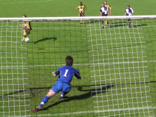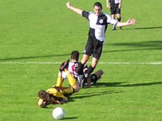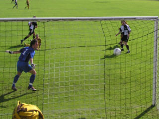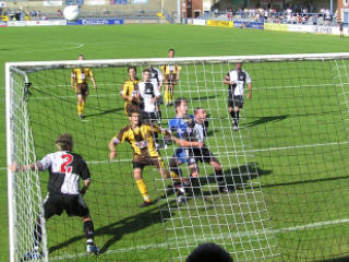 Top Right, A minute later, Cornwall adds his second of the match. Bottom Left, Cornwall's debut hat-trick is complete in the eighteenth minute. Bottom Right, Tony Quinton side-foots into the bottom corner from the edge of the box. U’s v Havant & Waterlooville (15/08/05) Two days on from his debut hat-trick, Luke Cornwall scored the only goal of the game at Havant to send United to the top of the Conference South. After the weekend’s resounding victory over Maidenhead, John Rains picked the same eleven to face the much sterner test that Havant would provide. United were outplayed in the first half, rarely creating an attacking threat and only some dogged defending and poor finishing kept the scores level going into the break. The Hawks had a couple of glorious chances, notably spurning what appeared to be a simple finish with twenty minutes gone when their striker rifled his shot across the goal and comfortably wide of the post from an unmarked position on the right of the area. Havant were also unlucky from a well-worked free kick and might have scored a thunderous effort from the edge of the box had Paul Honey not slid in to pull off a fantastic block. The best chance for the U’s fell to John Scarborough after Craig Watkins and Cornwall had combined to win a corner. Matt Gray’s dead ball from the left reached Scarborough at the back post but, under challenge, he could only place his diving-header wide of the upright. Half-time: U’s 0, Havant 0. The second half was a completely different story, though, and after Carl Emberson had saved well during a goal mouth scramble, United’s midfield took control of the game. Whereas Sutton had struggled to hold possession in the first half, Tony Quinton and Honey now had room to control the game from the middle and Gray and Eddie Akuamoah became ever increasing threats down the flanks. In a three minute period near the hour mark Sutton went close on three occasions, Gray and Cornwall both being denied by former U’s goalkeeper, Gareth Howells, and Lewis Gonsalves hitting a skidding shot that deflected wide of the left post from eighteen yards out. As the game wore on, United exposed Havant’s tiring defence on more and more occasions. The pace of Watkins proved a particular problem for Havant and twice he could have opened his account for the season, only to miss the ball when Quinton and Cornwall had torn apart the defence and then for Howells to save excellently at his feet. For all of United’s domination of the half, Havant looked far from out of the game but once again found Emberson in excellent form when a deep free kick was driven fiercely at goal at the back post. Almost immediately United went on the attack, spreading the play wide to the left to Akuamoah, who beat the right back and hit a great cross to the near post where Cornwall glanced a header into the far side of the goal to break the deadlock with only ten minutes left, 1-0. Akuamoah and Gray continued to torment the Havant full backs, to the extent that the defenders had to resort to bringing Sutton’s wingers down time and time again in an effort to counteract their influence. One such foul on Akuamoah gave Gray the opportunity to strike at goal from the free kick but Howells was equal to the low effort. With a minute left, Havant came as close as possible to taking a share of the points, but when they finally got the ball past Emberson, Gary Elliott came from nowhere to clear the ball off of the line, his second goal-saving moment of the match, having earlier blocked a shot destined for the top corner. That proved to be the Hawks’ last chance of the match as Sutton played out the injury time in the Havant half of the field until the referee’s whistle sent the United fans wild – “We’re top of the league, We’re havin’ a laugh!”. Final score: U’s 1, Havant 0. F-t-L Facts: