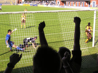 Top Right, Jamie Mackie shows good strength before slotting the second past the 'keeper. Middle Left, Eddie Akuamoah converts Matt Gray's cross for the third. Middle Right, Mackie is brought down in the box to win the penalty. Bottom Left, Gray strikes the fourth from the penalty spot. Bottom Right, The 'keeper has no idea where the ball is as Gray's corner curls towards goal for the fifth. |